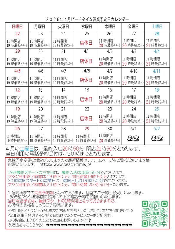 19時最終スタートの営業日は 最終入店18時50分 閉店19時50分となります。